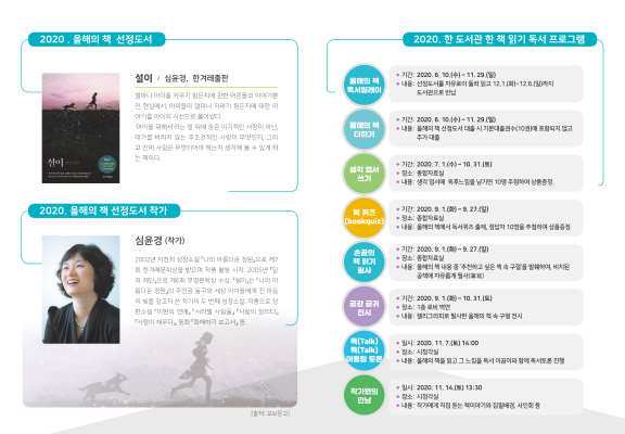 양산도서관은 독서문화 조성을 위하여 한 권의 책을 함께 읽고, 느낌을 공유하는 '2020. 한 도서관 한 책 읽기'사업을 운영합니다.